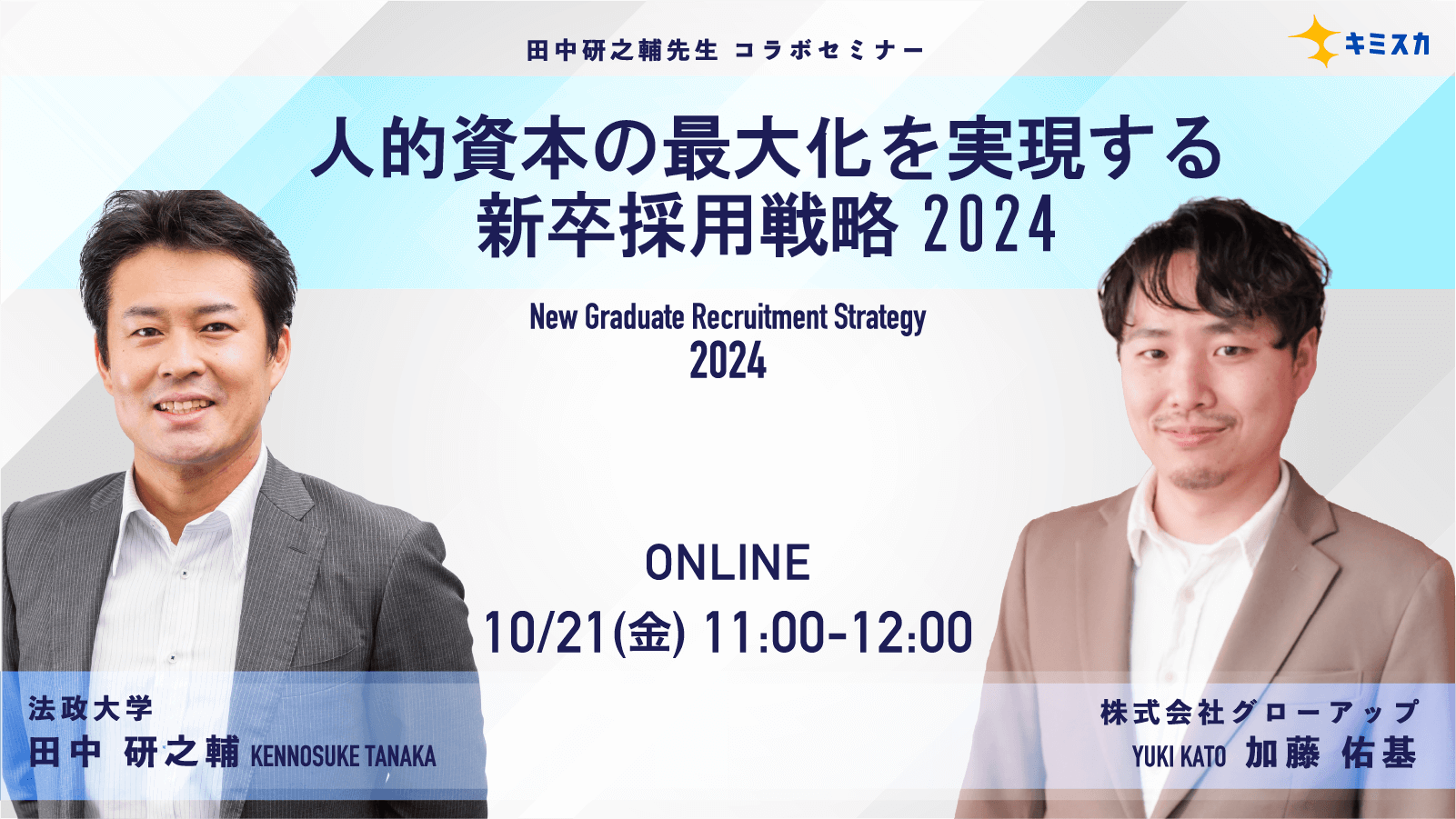 株式会社グローアップ(本社:東京都港区、代表取締役:鈴村 賢治)が運営する新卒向けダイレクトリクルーティングサービス「キミスカ」は、10月21日(金)に法政大学 田中研之輔教授をお招きして、企業向け新卒採用セミナーを開催することをお知らせいたします。企業において重要性を増す「人的資本経営」と新卒採用を結びつけ、採用現場での動き方をお話いたします。