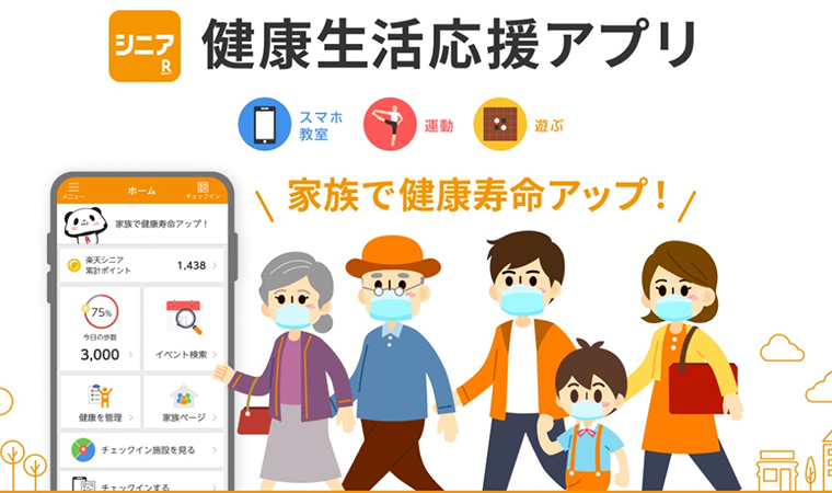 「楽天シニア」は、2019年6月に開始後、政策課題のひとつである「健康寿命延伸」をサポートするサービスを提供しています。専用の健康生活応援アプリの累計ダウンロード数は100万を突破(注3)しており、利用者は日々の歩数測定や健康管理機能、運動、趣味・遊び、健康講座、音楽など、多種多様なジャンル別のイベントへの予約や参加、対象施設へのチェックインで「楽天ポイント」を貯めることが可能です。また、企業や自治体とも連携し、「楽天シニア」を活用した社会参加と健康増進のサポートを行っています。