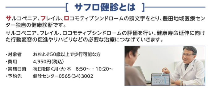健診センターにおいて、年間約6万件の施設内での各種健診を提供しており、具体的には総合健診として人間ドック、臓器別健診として脳ドック、肺ドック、動脈硬化ドック等をご用意しています。また、地域リハ イノベーションセンターでは、2021年11月から新たにサルコペニア、フレイル、ロコモティブシンドロームの頭⽂字をとったサフロ健診を実施しております。豊田地域医療センターの各種健診を受けた方々に対して、生活習慣病の予防や改善、並びにサフロの予防に資するサービスとして、楽天シニアやモフライフ等をご案内いたします。