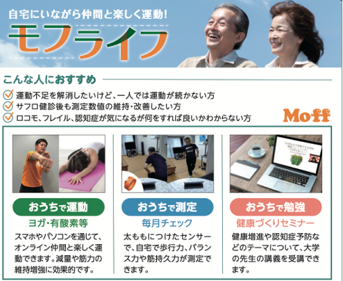 「モフライフ」は、オンラインを活用した高齢者向け健康増進サービスです。オンラインながらに会話を伴うアットホームな雰囲気な中で、仲間と共に汗を流して運動できるサービスです。独自のモーションセンサー「Moffバンド」を使ったデジタル体力測定により、自分の体力を定期的に確認することで、運動効果を実感することができる点が特徴です。個人単位でのご契約の他、自治体でのオンライン通いの場事業、体力測定事業、オンライン介護予防実証等で活用頂いた実績を有します。