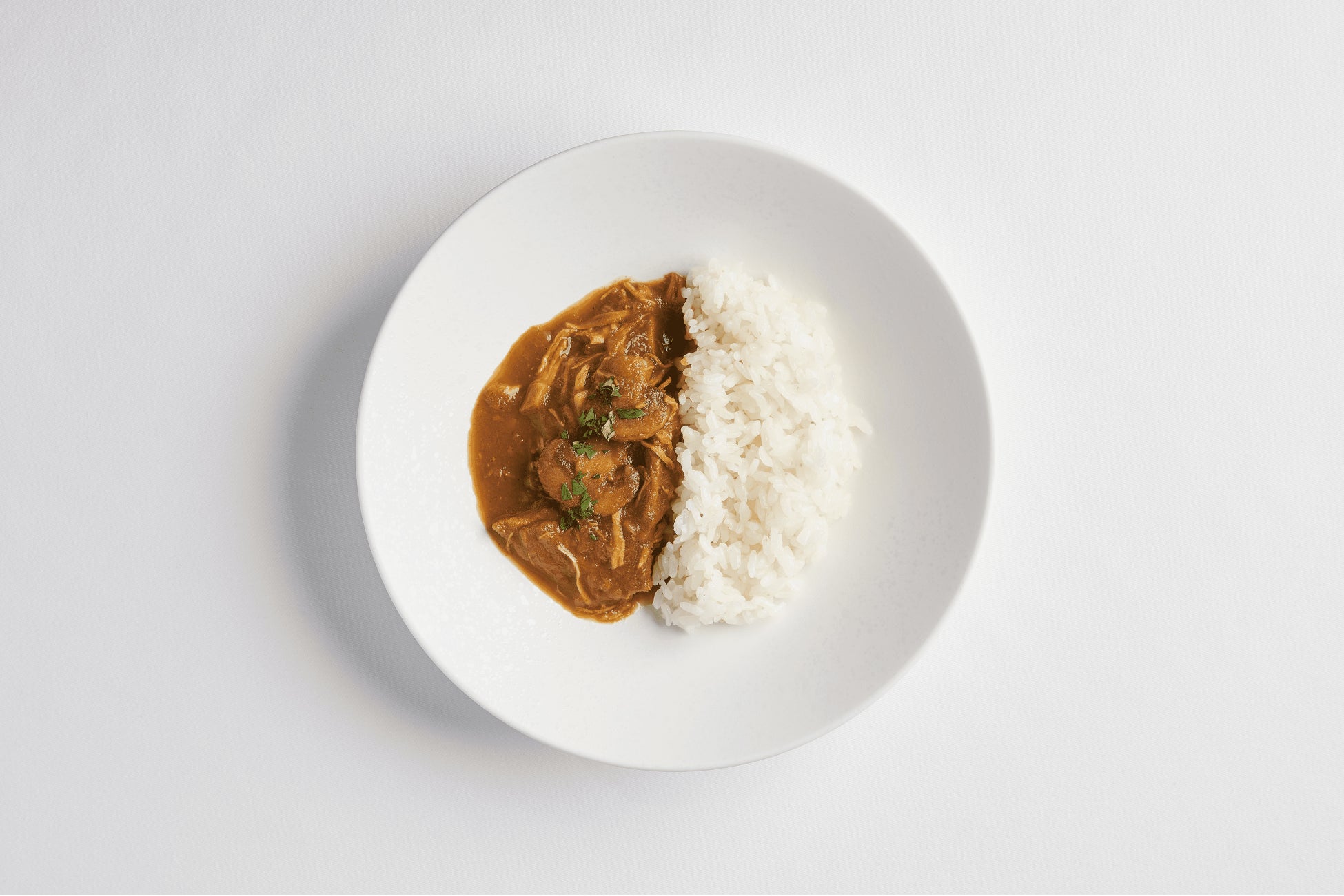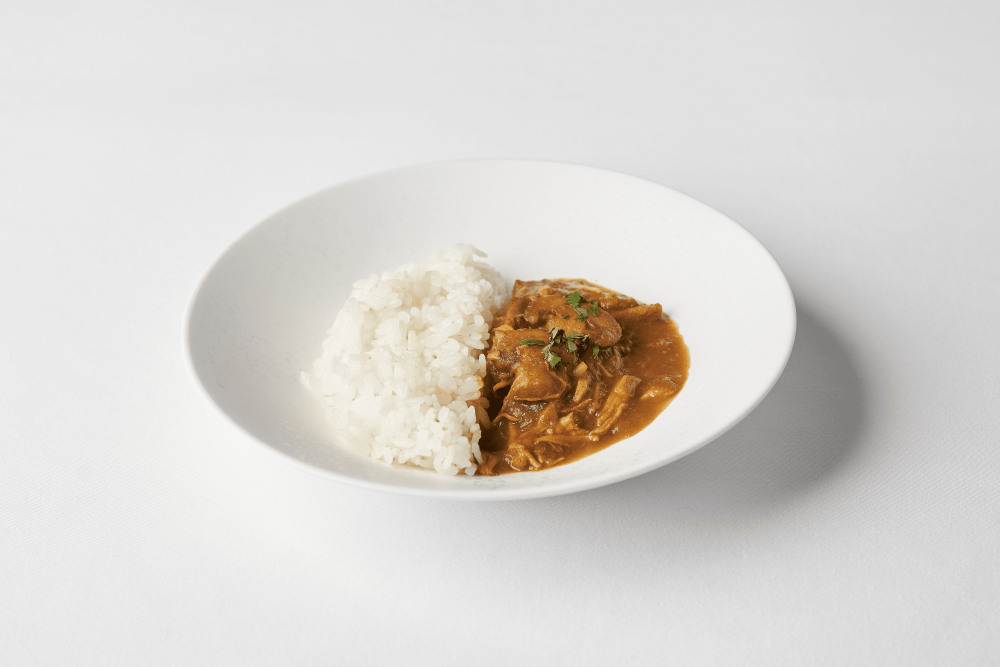 浦野シェフがまだ10代だったホテル修行時代に何度も作った伝統のカレーを、現代風にアレンジしながらグルテンフリーで再構築しました。奥久慈の長閑な山間地域で平飼いされる地鶏「奥久慈しゃも」を、ほろほろとほぐれるまで煮詰め、風味のよい美浦のマッシュルームがアクセントになっています。