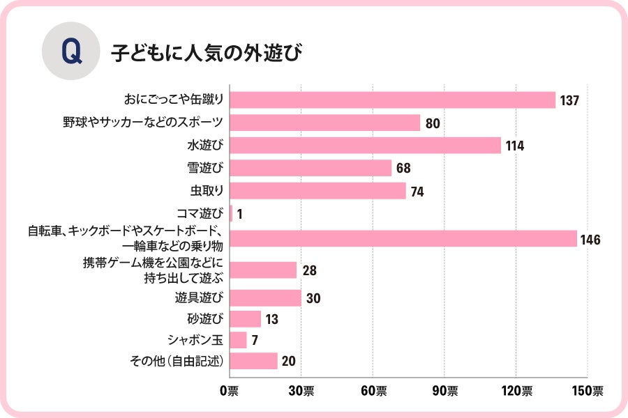 「野球やサッカーなどのスポーツ」という昔から人気の外遊びがそこまで多くない一方、「携帯ゲーム機を公園などに持ち出して遊ぶ」という時勢を表した回答も一定数見られました。