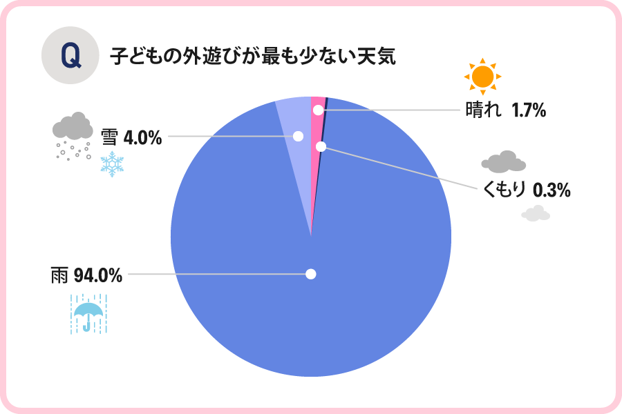 子どもの外遊びが最も少ない天気についての調査では、「雨の日」が94.0%という結果となりました。
