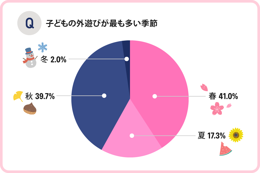 外遊びが最も多い季節は、「秋」の39.7%を押さえ、「春」が41.0%と最多でした。