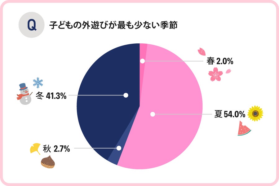 子どもの外遊びが最も少ない季節は、「夏」で54.0%という結果となりました。
