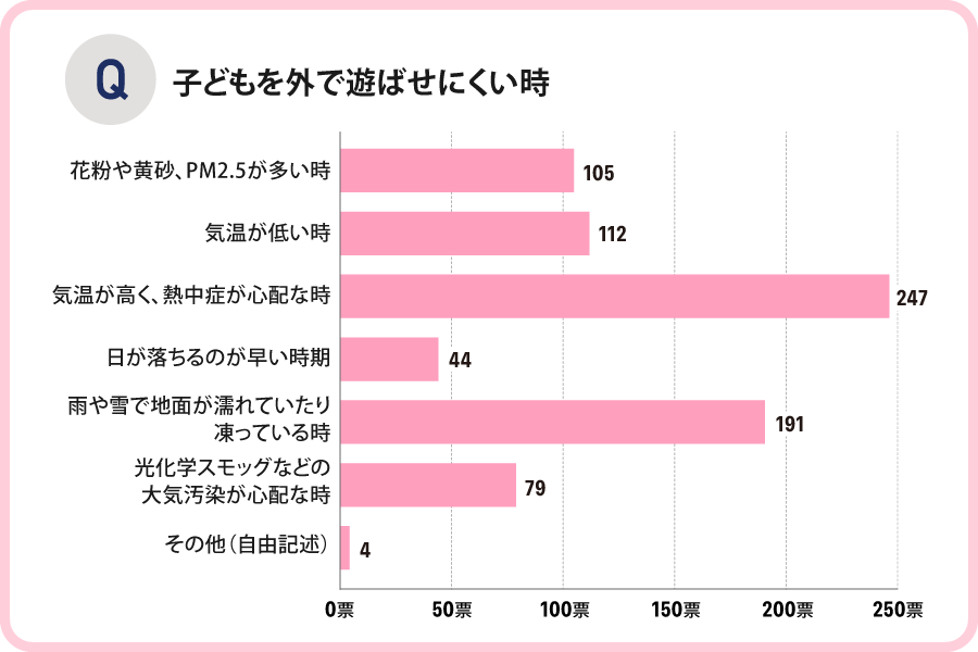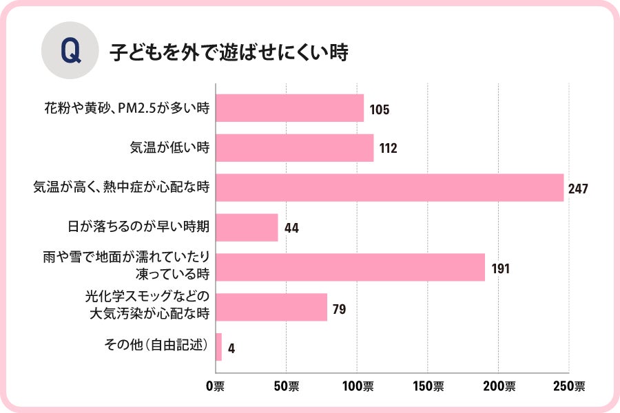 次に、子どもを外で遊ばせにくいのはどんな時かについて調査したところ、「気温が高く、熱中症が心配な時」という回答が圧倒的に多く、「気温が低い時」や「雨や雪で地面が濡れていたり凍っている時」を大きく超えました。