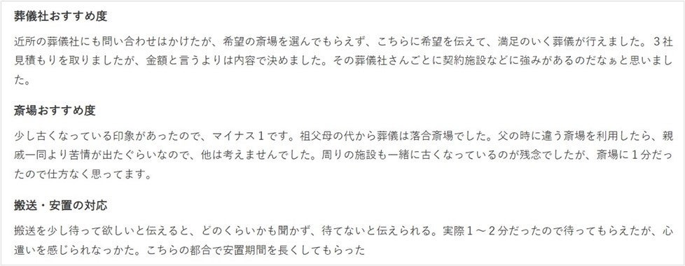 1.葬儀事例と喪主やご家族からの口コミを同一ページ内で閲覧できる機能