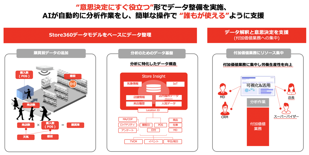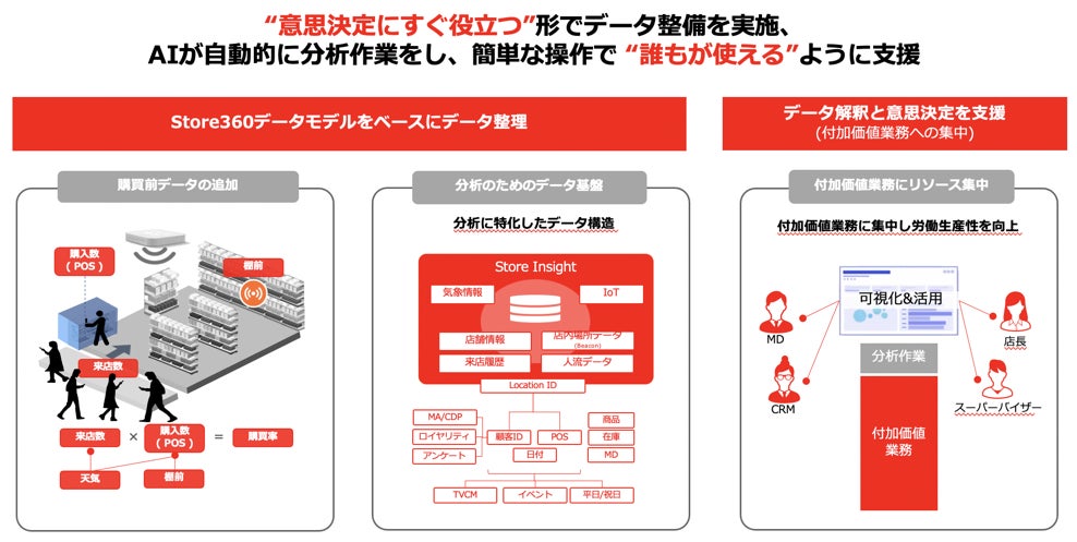 STORE360サービスのリリースにより、これまでの企業主体で一方的に顧客データを取得する「サービス不在のデータ取得時代」から、「高品質な顧客体験を前提としたデータ取得時代」へスムーズな移行支援を強化して参ります。また分析機能も大幅に強化し、取得できた大量のオフラインデータから分析時間ゼロでインサイトを得られるAI自動分析機能を追加しました。これにより、STORE360は消費者へ質の高いリアル店舗体験を提供するだけでなく、小売企業従事者にはAIによる新しいデータ活用体験を提供します。