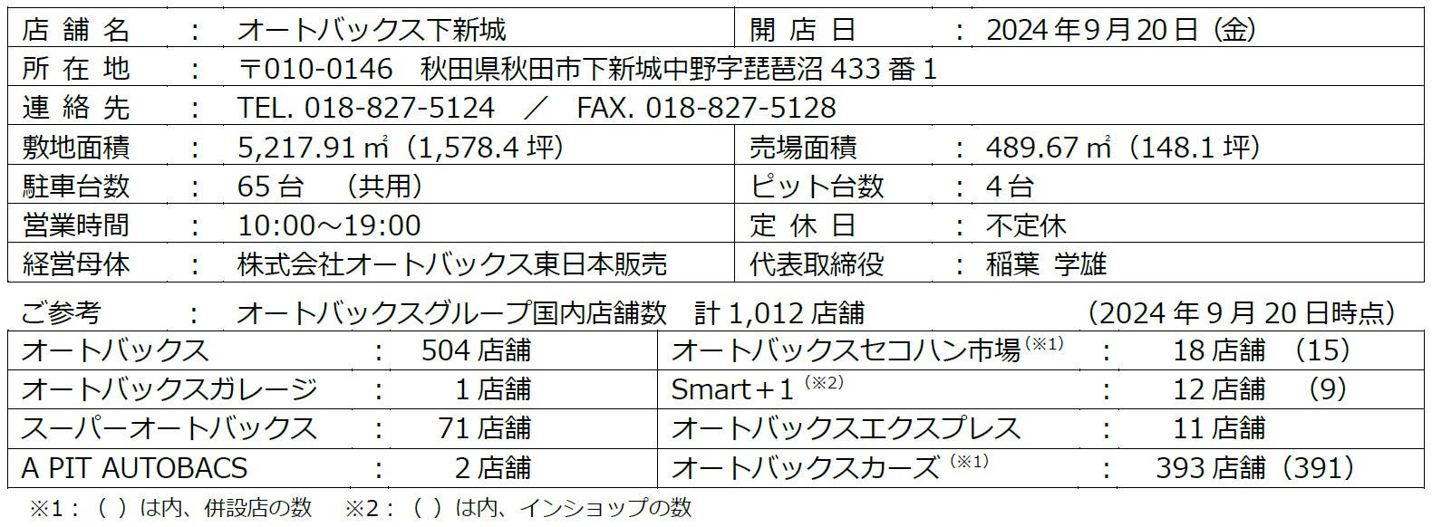 株式会社オートバックスセブン(代表取締役 社長:堀井勇吾)と加盟店契約を結んでいる株式会社オートバックス東日本販売(代表取締役:稲葉学雄)は、2024年9月20日(金)に「オートバックス下新城」を新規オープンいたします。
