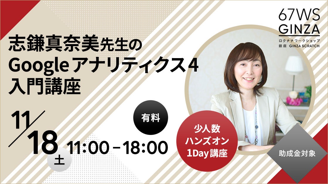 11月18日開講の1日集中・セミパーソナル・ハンズオントレーニング「志鎌真奈美 のGoogleアナリティクス4入門講座」の受講者募集をを開始いたします!