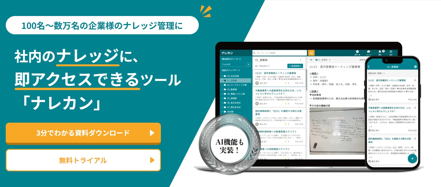 ”ナレッジ管理ツール『ナレカン』”は、当社が開発・運営する、大手企業から中堅企業様の抱え