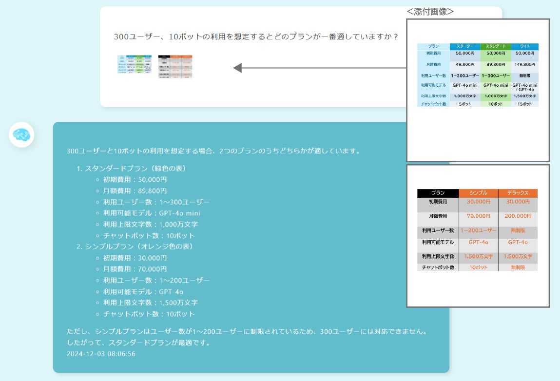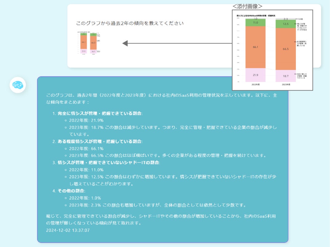 ユーザーがアップロードした画像ファイル(PNG、JPEG)から物体、シーン、テキストなどを特定し、画像に関連する質問の回答を生成する新機能を搭載しました。この新機能により、従来のテキストデータに加えて画像データからも迅速に回答を得ることが可能となります。これにより、業務効率が一層向上し、AI活用による一足飛びのDX推進が期待されます。