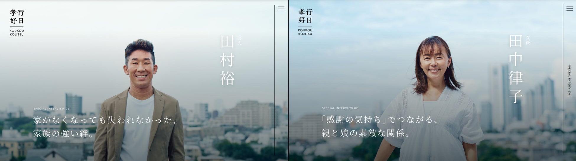 スペシャルインタビューでは、親孝行について女優 田中律子さんとお笑いタレント田村裕さんにそれぞれお話を伺いました。