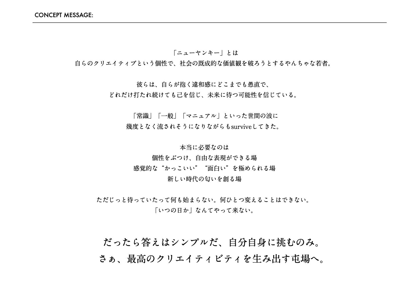 13名の住人は選考により決定し、1年間で卒業。1年という限られた期間で仲間とともに自身のクリエイティブを磨き上げ社会にアウトプットしていく「ニューヤンキー」たちが集結します。