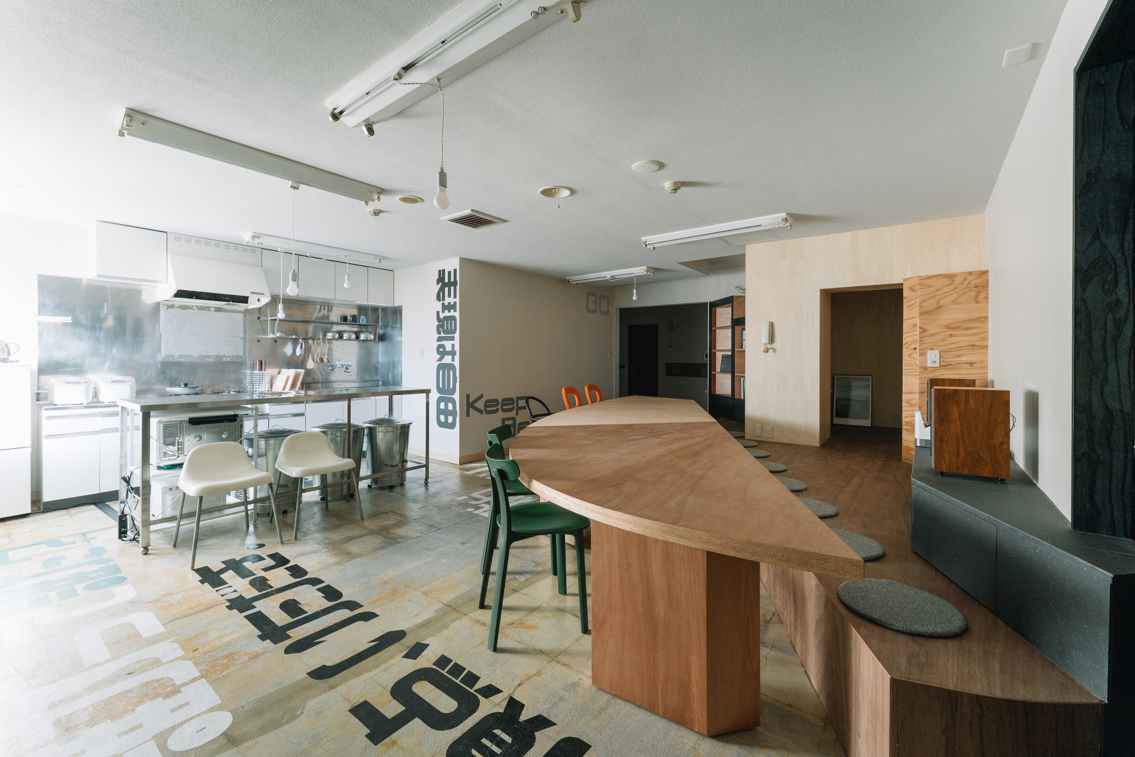 可動式家具やグラフィックをトリガーに、皆で集まることも、個々で分散し使うことも、あらゆる屯い方を受け止めるユニークな空間。