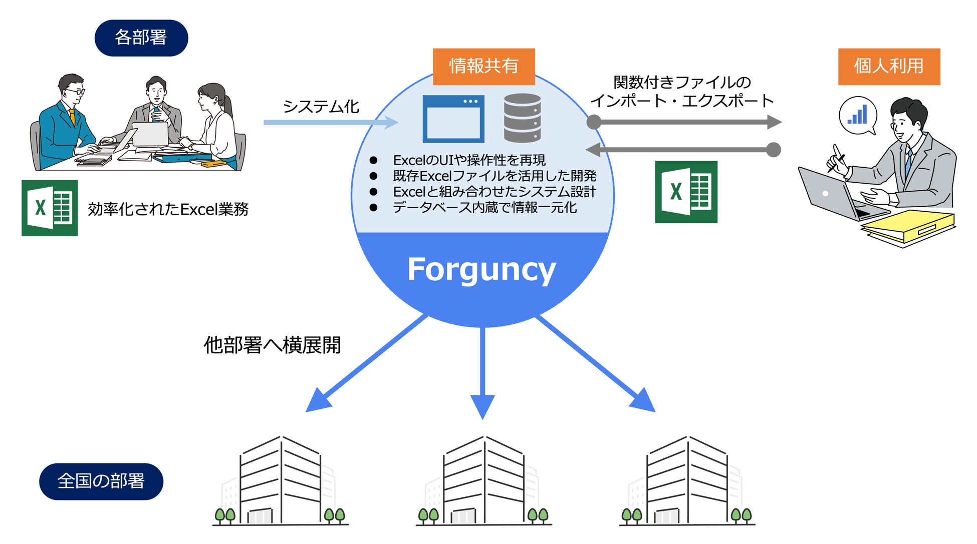また、部門をまたいだデータ活用にもForguncyは有効です。今までシステム化が進んでいなかった領域では、部門内のExcelを他部署が活用できず余計な転記や集計が行われていました。Forguncyはデータベースを内蔵しているため、データを一元的に使える器として部門以外の人もデータを扱えるシステムが作成可能です。