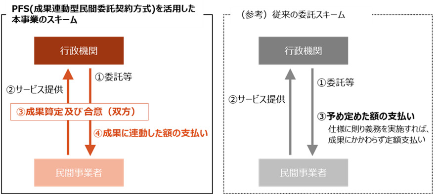人口減少や少子高齢化の進行、新型コロナウイルス感染症の影響等により、行財政事情は日々厳しくなり、また地域の社会的課題は複雑化しております。このような状況下で行政機関が業務の効率化・予算の効果的な活用を図り、官民が連携して社会的課題の解決を図るための事業手法としてPFSの導入が推進されています。弊社はこれまで培った成果報酬型案件に関する豊富なノウハウを生かし、PFSの活用を通じて行政課題の解決に貢献することを目指しております。