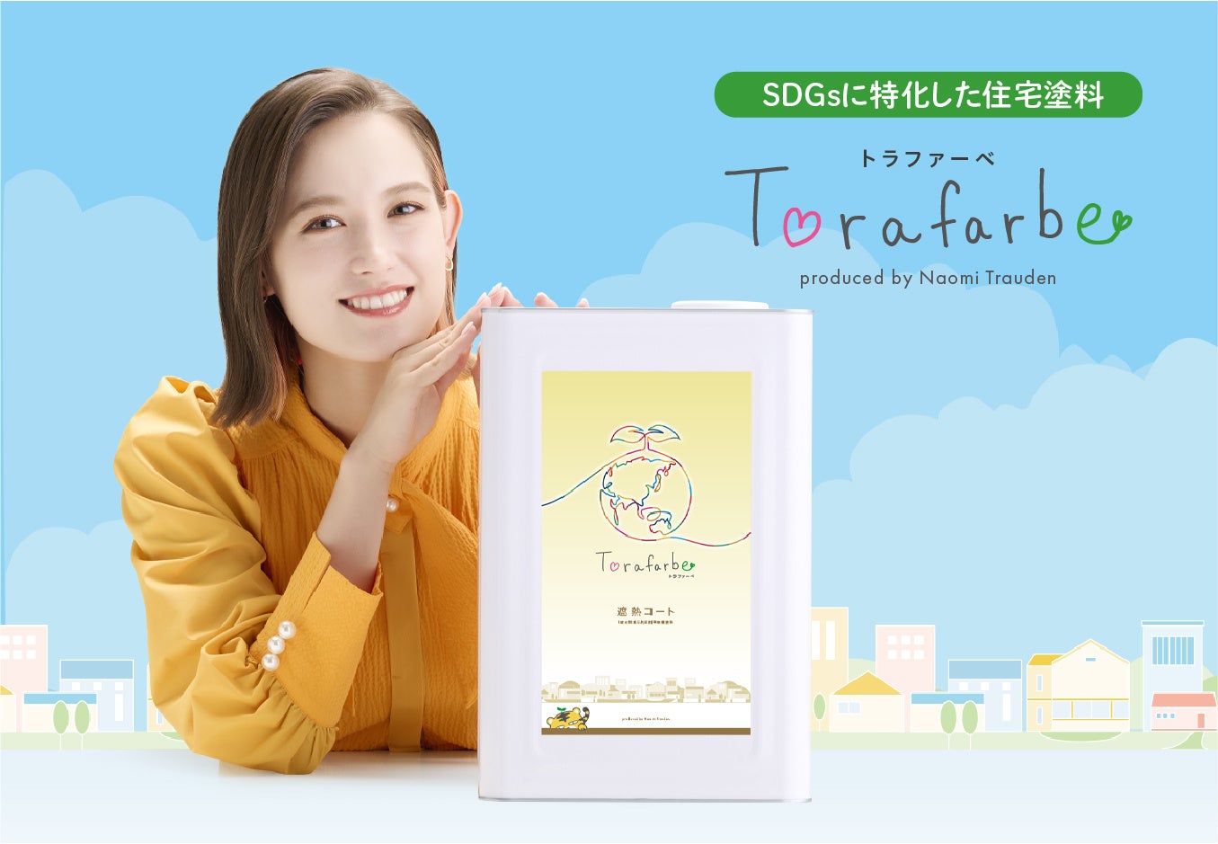 トラファーべは、塗料メーカーのイメージキャラクターに起用されたことをきっかけに、住宅用塗料・塗装が及ぼす環境問題を知ったトラウデン直美さんが企画・プロデュースした、今日の住宅塗料の課題・問題解決にできうる限り取り組んだ環境配慮型塗料です。