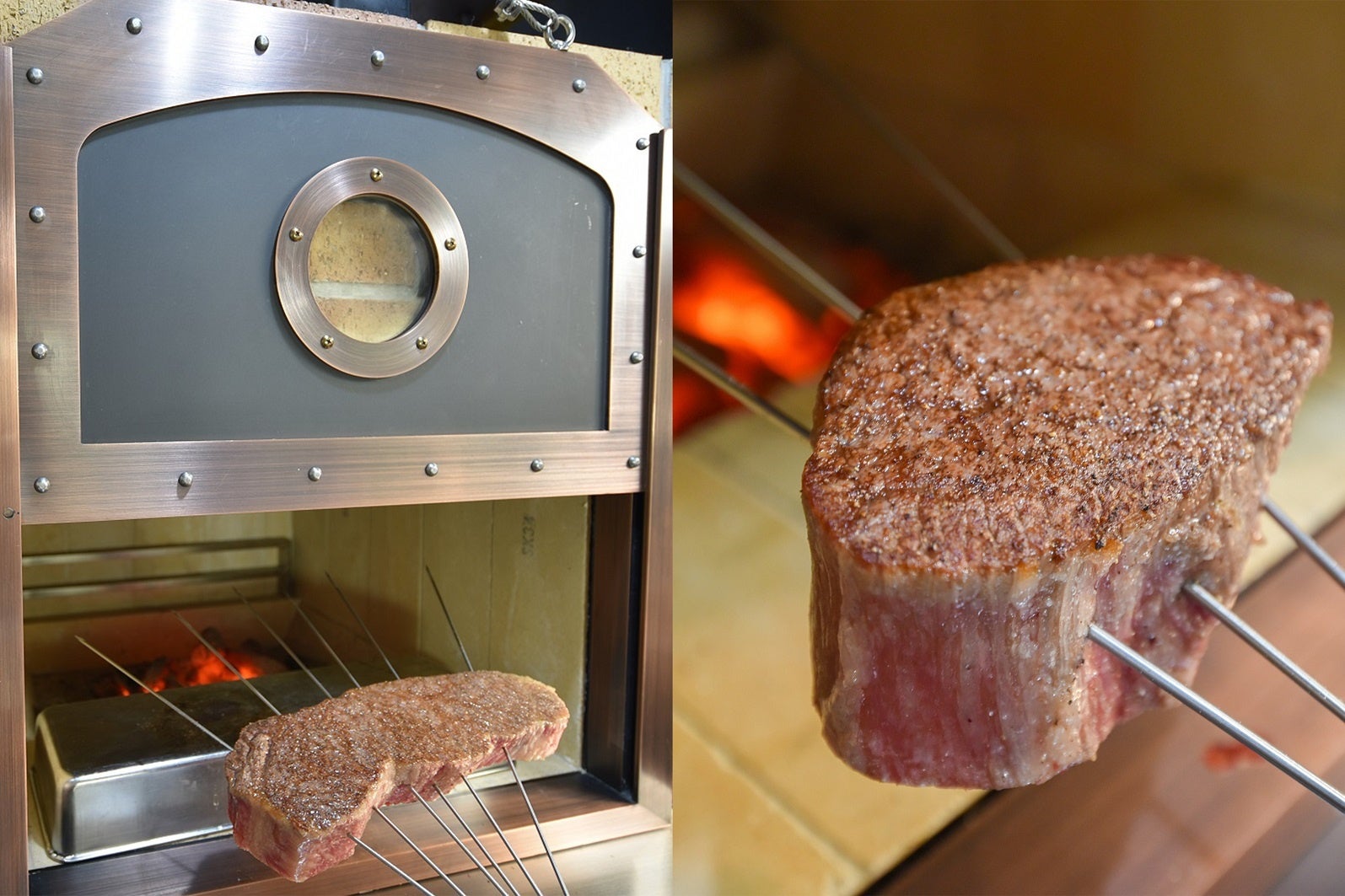 極上の牛肉を焼き上げるのは、当店自慢の炭火炉窯です。三つ星レストランを渡り歩いたシェフが完璧なステーキの焼き方を追求し、たどり着いたのが炉窯を使って炭火で焼く方法でした。店内への炉窯の設置はさまざまな法規制により難しく、当店は炭火炉窯を備えた貴重な一軒となります。炉窯では紀州備長炭の900℃の直火で肉の表面を香ばしく焼き、遠赤外線の輻射熱と特注レンガの蓄熱で肉汁をぎゅっと閉じ込めます。さらに炭焼きの薫香も加わり、肉にストレスがかからず旨味がこれ以上なく引き出された絶品ステーキをお召し上がりいただけます。