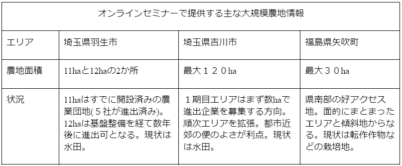 今回開催するオンラインセミナーでは、こうしたかたちで当社がかかわる自治体の大規模農地情報を提供します。