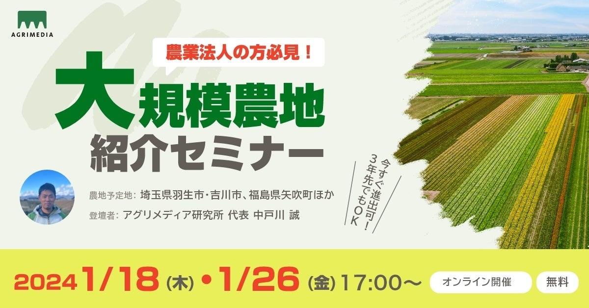 農業ビジネスを展開するアグリメディア(目黒区、代表取締役:諸藤貴志)は2024年1月、面的にまとまった大規模農地を紹介する農業法人向けオンラインセミナーを開催します。当社がコンサルタントとして関わる関東・東北地方の「農業型街づくり」に関する情報を提供し、セミナー後には希望者を対象に現場視察や実際の進出支援を行います。日本の農地は所有権が細分化され、農家・農業法人は点在した農地での耕作を余儀なくされています。当社が地権者協議に関わるなどして面的にまとまった条件のよい農地への進出を促すことで、拡張意欲の高い農業法人の成長を後押しします。
