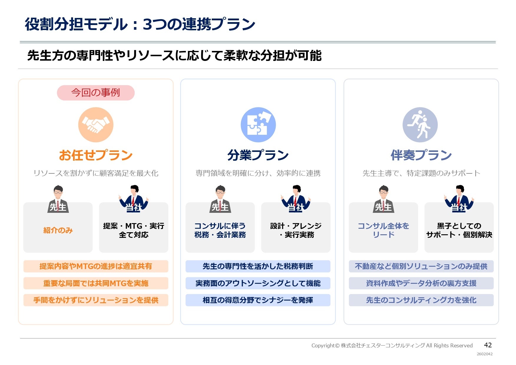 先生方の専門性やリソースに合わせた3つの連携プラン(お任せ、分業、伴走)を提案 。