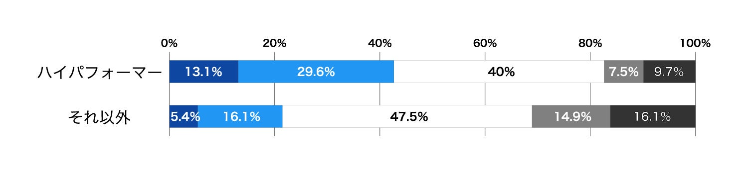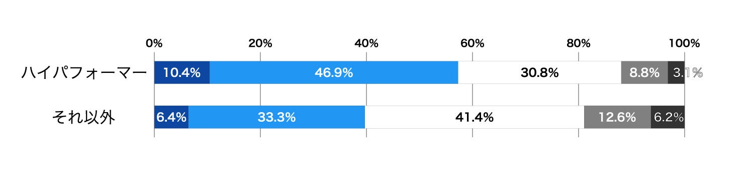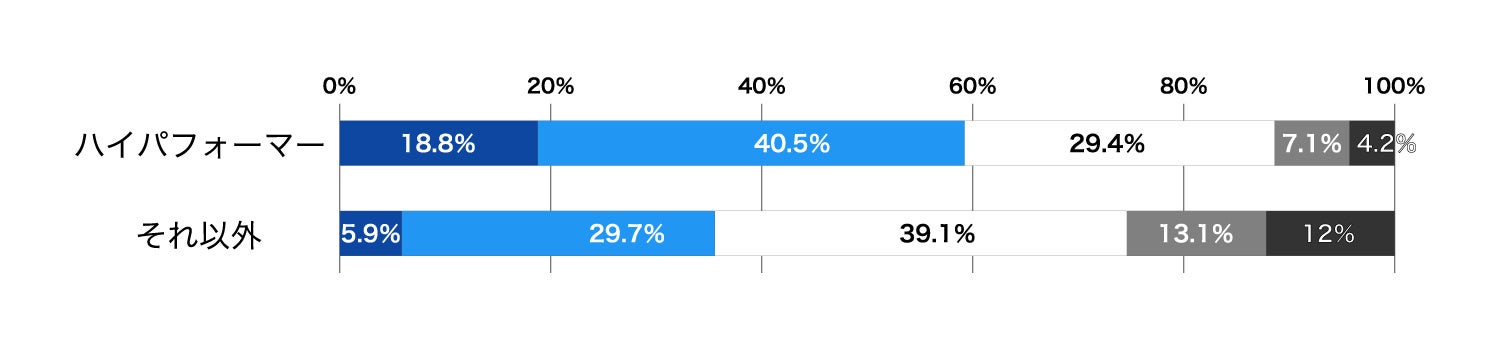 「あてはまる」「どちらかと言えばあてはまる」と回答したハイパフォーマーが55.9%、それ以外は29.7%