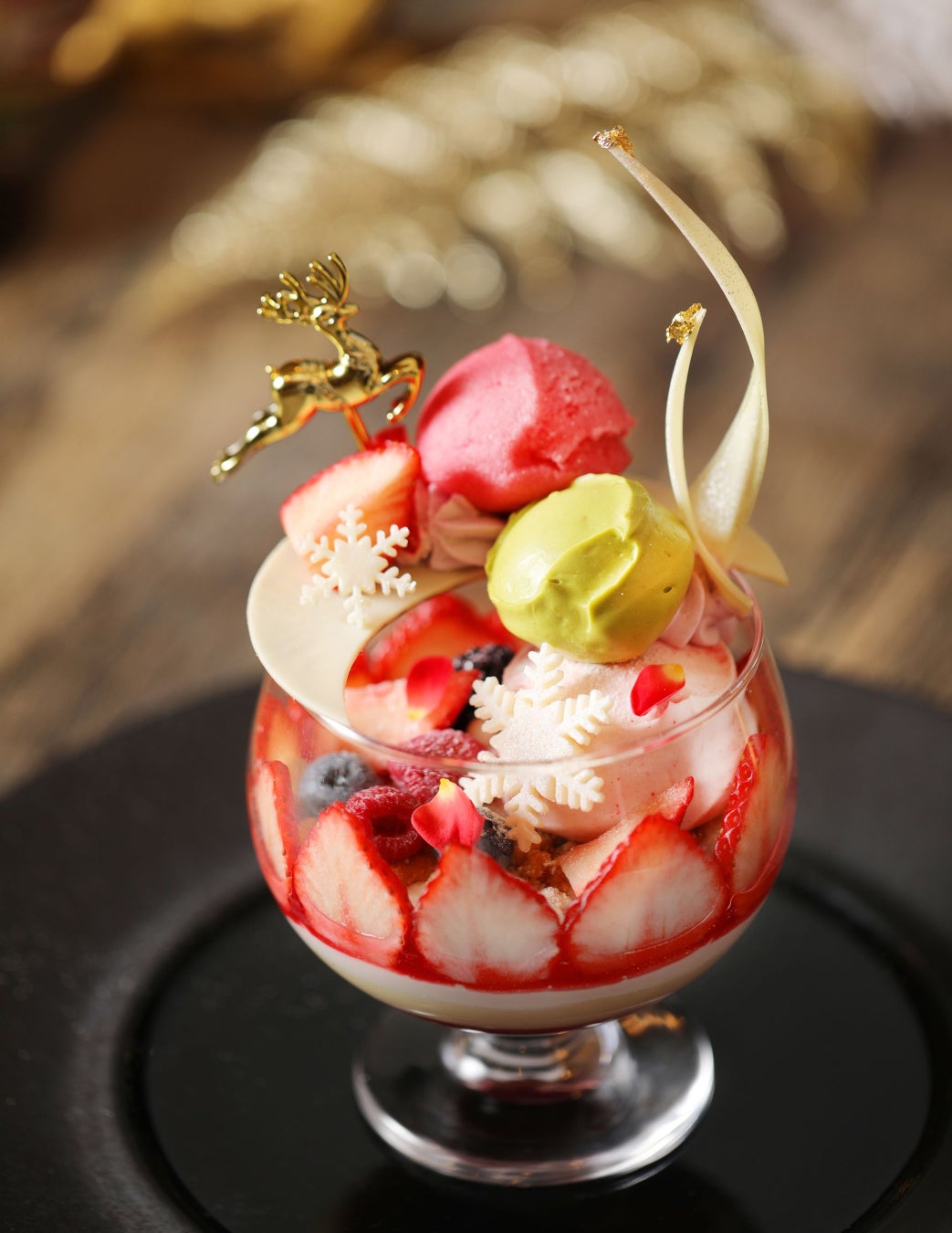 苺やベリーの甘酸っぱさに、ザクザクとしたクッキーやチョコレート飾り、そして3 種類のアイスが織りなす相性は抜群です。仕上げのパウダースノーで、まるでスノードームを覗き込むような幻想的な世界を表現しました。