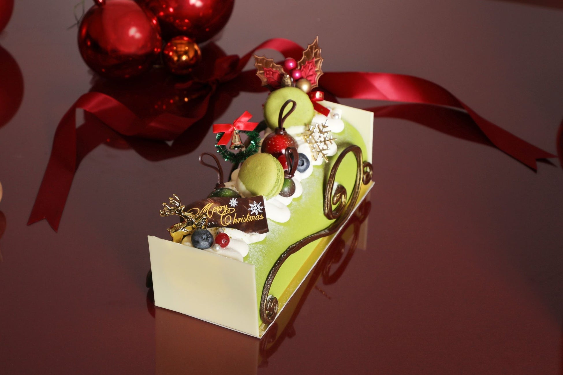 降り積もる雪を駆け抜けるソリをイメージしたピスタチオ好きにはたまらないクリスマスケーキ印象的なグリーンのムースの中に、香り豊かなピスタチオムースと濃厚なクリームを重ね、甘さと酸味、食感のハーモニーを楽しめます。