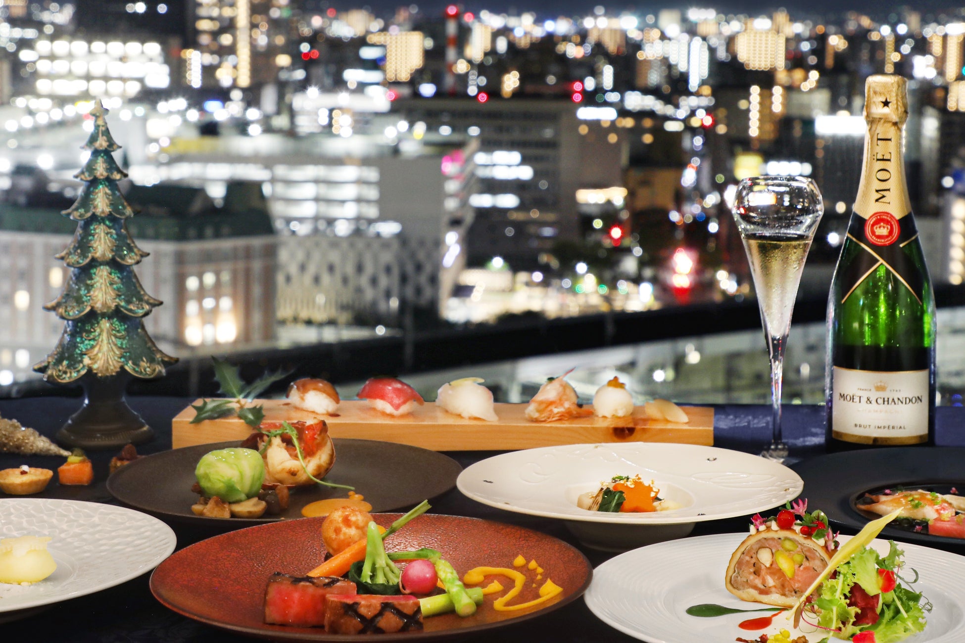 前菜8種から始まる会席スタイルのクリスマススペシャルディナーです。和食の華とフレンチの輝きをホテル最上階で。岡山の夜景と共にお楽しみください。