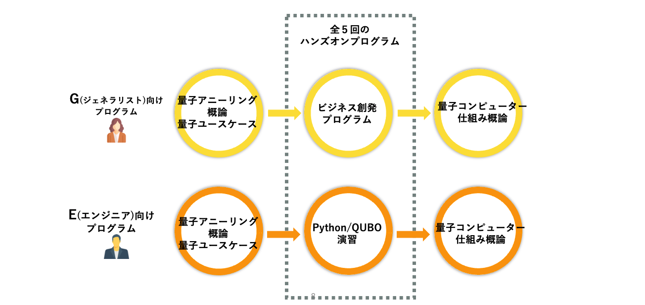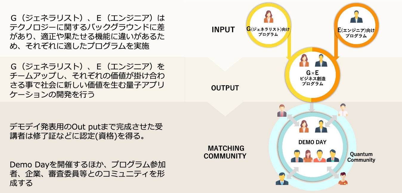 経営や事業開発、財務・広報・知財法務等のビジネス分野に専性を有する人材を「ジェネラリスト(G)」、何等か技術分野に専門性を有する人材を「エンジニア(E)」と呼称し、それぞれを対象としたプログラムを開発します。また、ジェネラリスト(G)、エンジニア(E)をチームアップし、それぞれの価値が掛け合わさることで社会に新しい価値を生む量子アプリケーションの開発を行うプログラムも開発します。