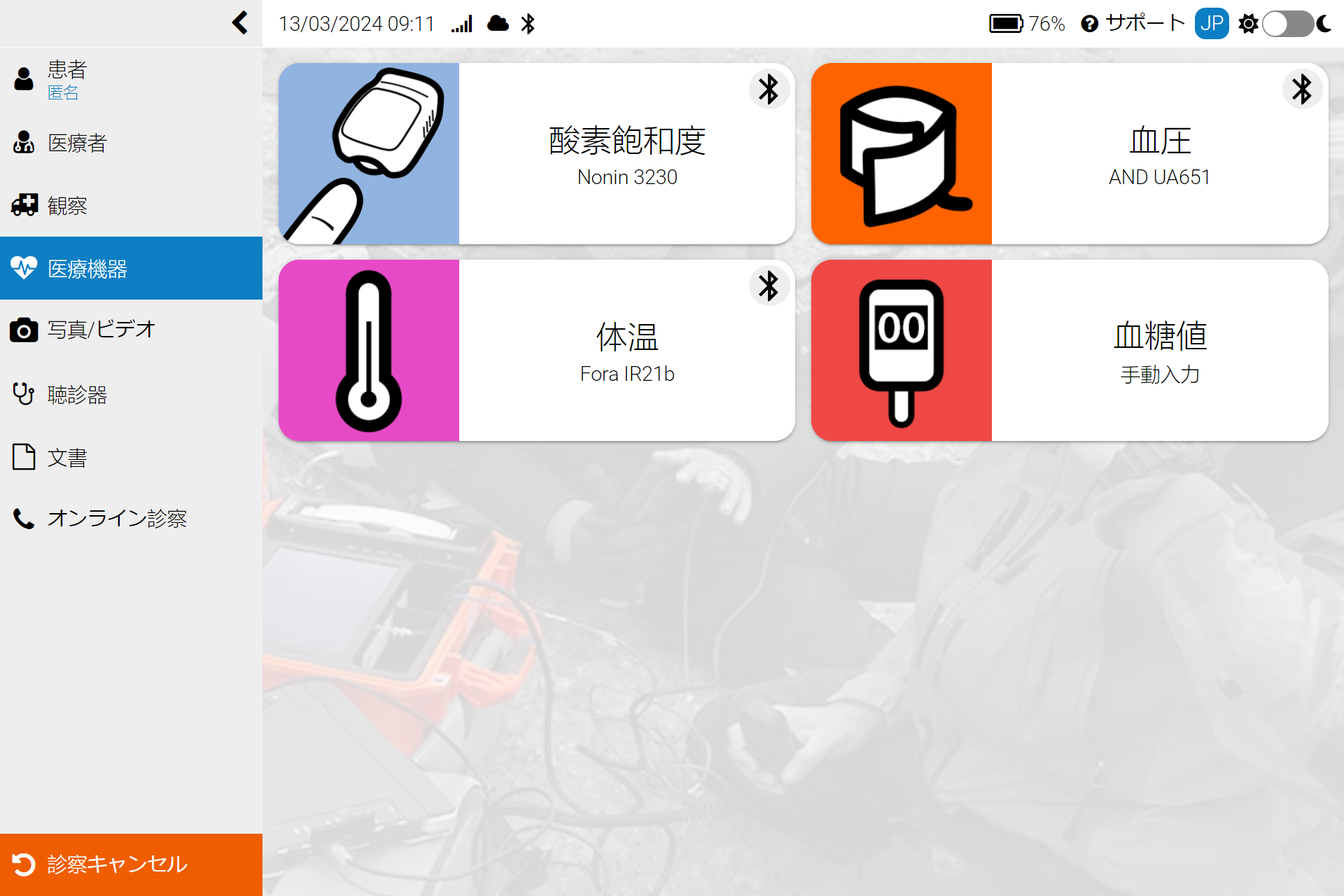 対面診療と同じ用に患者の検査データ(血圧、体温、血中酸素濃度、血糖値など)を事前、あるいはリアルタイムに収集し検査データを見てからオンライン診察が可能