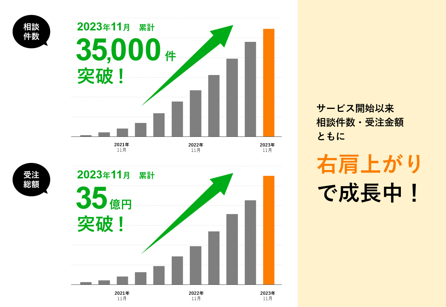 ユーティルは、中小企業を中心としたDXへの取り組みを支援するため、Web制作に関する相談カウンター「Web幹事」、動画制作に関する相談カウンター「動画幹事」、システム開発に関する相談カウンター「システム幹事」、営業代行に関する相談カウンター「営業幹事」などを運営しております。これらのサービスを通じたユーティルへの相談件数は順調に成長しており、お客様からのご相談件数は35,000件を、また受注総額は35億円を突破しました。