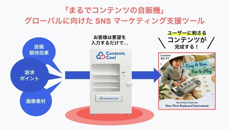 「Contents Cool for reel V」のコンセプトは、海外向け SNS 運用、SNS 広告において最重要である「海外向けのショート動画作成に特化したマーケティングツール = 海外向けコンテンツの自動販売機」です。