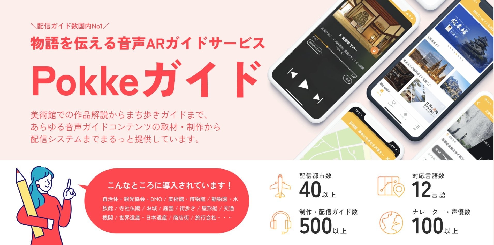 現在、Pokkeは国内で最もインストールされた音声ガイドアプリであり、日本を含む世界20か国60都市で500を超える音声ガイドコンテンツを提供しています。