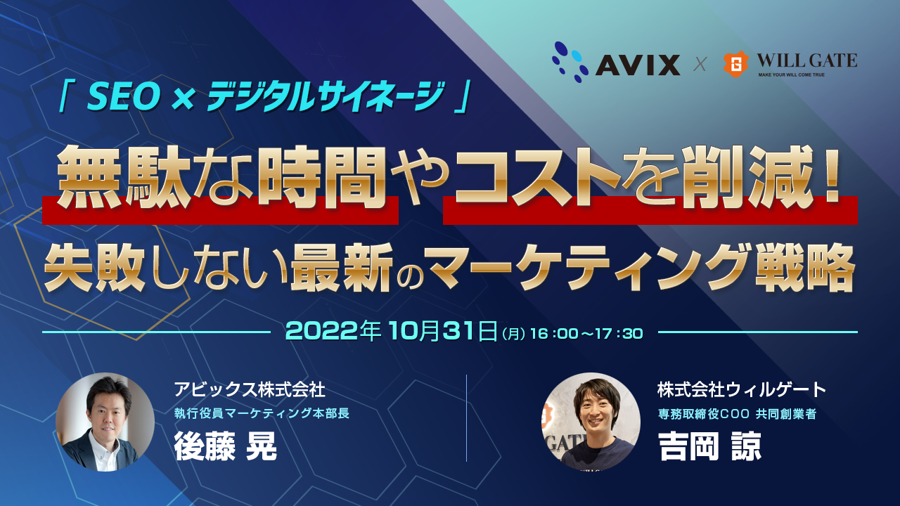 この度、株式会社ウィルゲート専務取締役COO吉岡⽒とアビックスの執行役員マーケティング本部長の後藤が登壇し、、『“SEO × デジタルサイネージ”失敗しない最新のマーケティング戦略』をテーマにしたオンラインセミナーを10⽉31⽇(⽉)に開催いたします。(申し込み先:https://bit.ly/3MWkaIs)