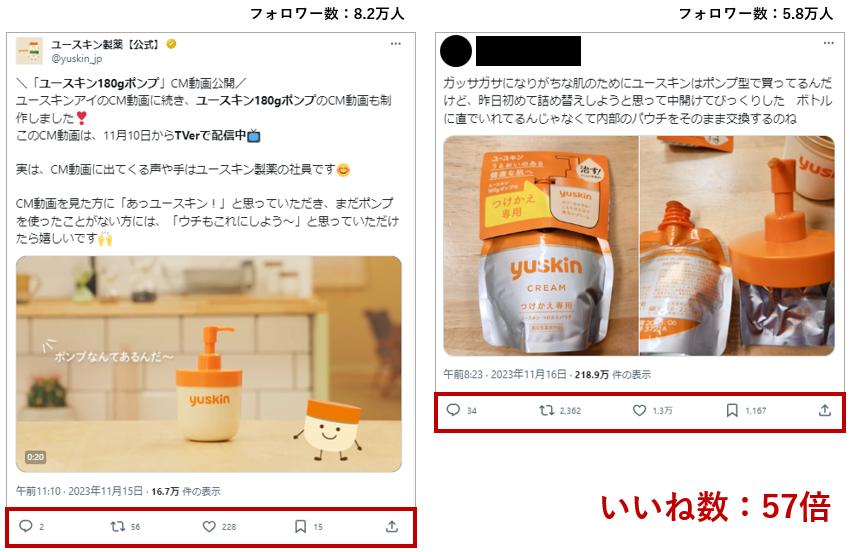 実際ユースキン様にて「ポンプタイプの詰め替え方法」についての投稿では、いいね数に57倍の差がありました。