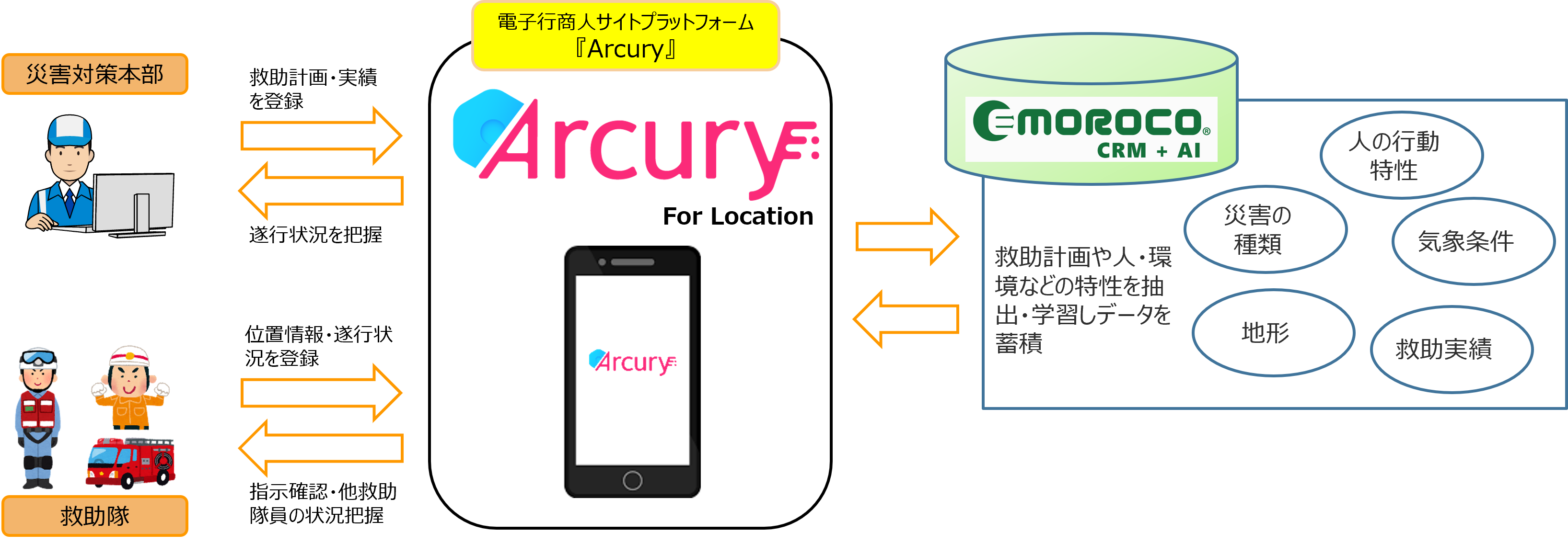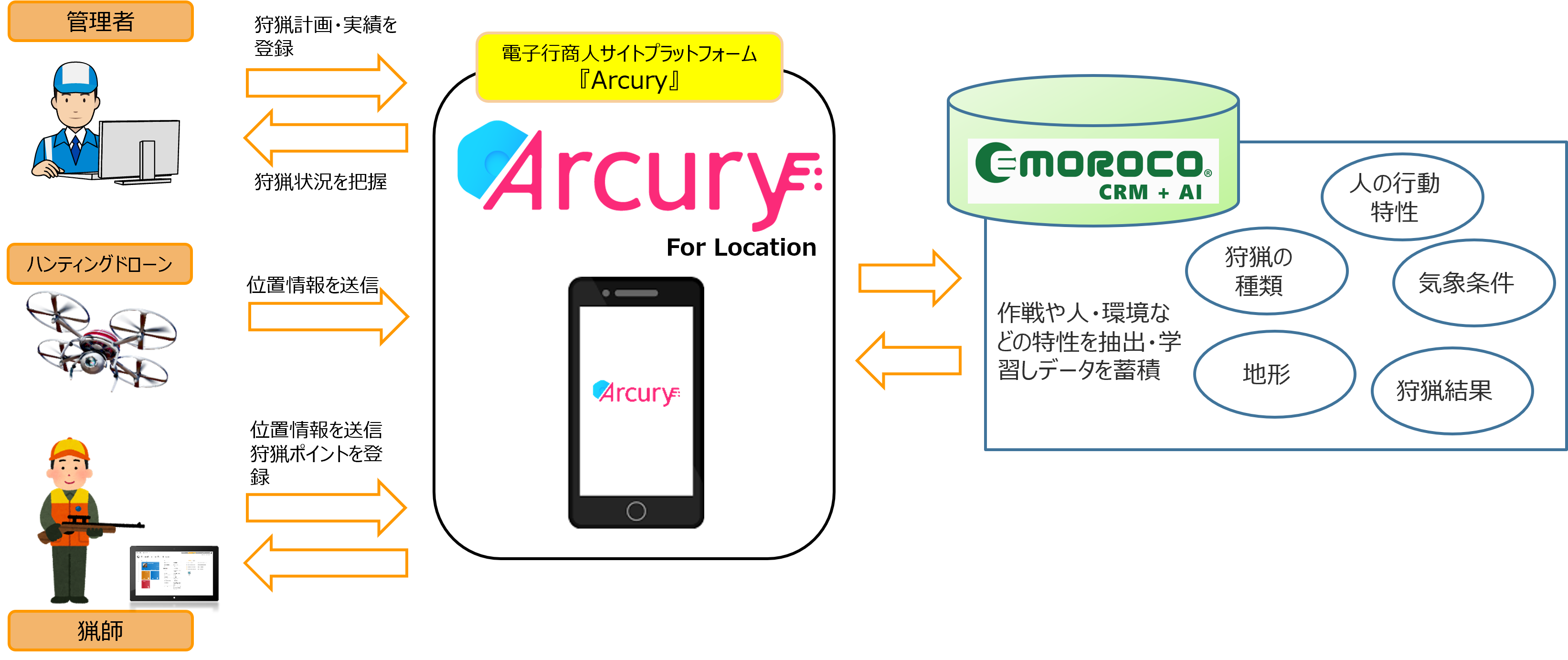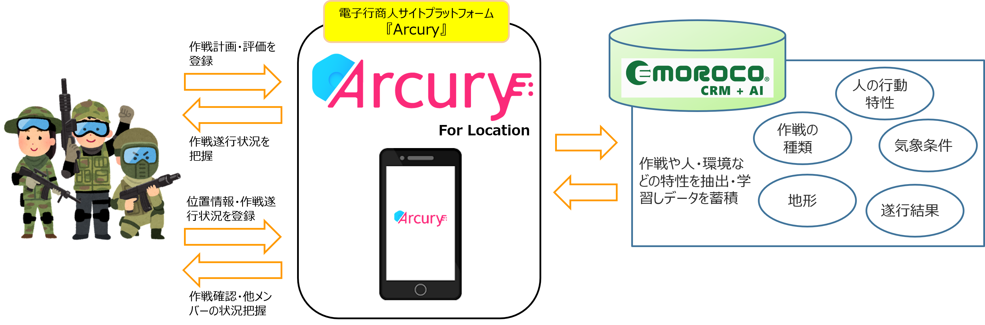アーカス・ジャパンが提供するArcury for Locationは、狩猟、イベント、災害時の救助活動等、チーム内の動きをリアルタイムで把握し、作戦の計画から遂行・評価までを支援するサービスです。電子行商人(EM)サイトプラットフォームであるArcuryをベースとしておりますため、CRM(顧客管理)とAI(人工知能)が一体となり、作戦遂行後の評価結果から類似パターンを学習し、効率よく作戦遂行が行える計画を提案します。