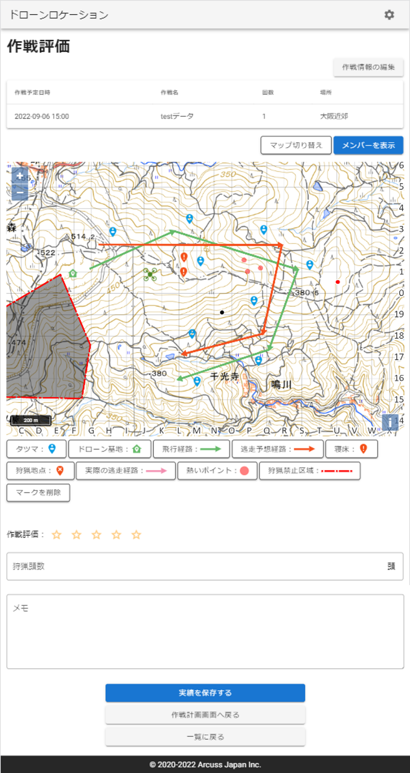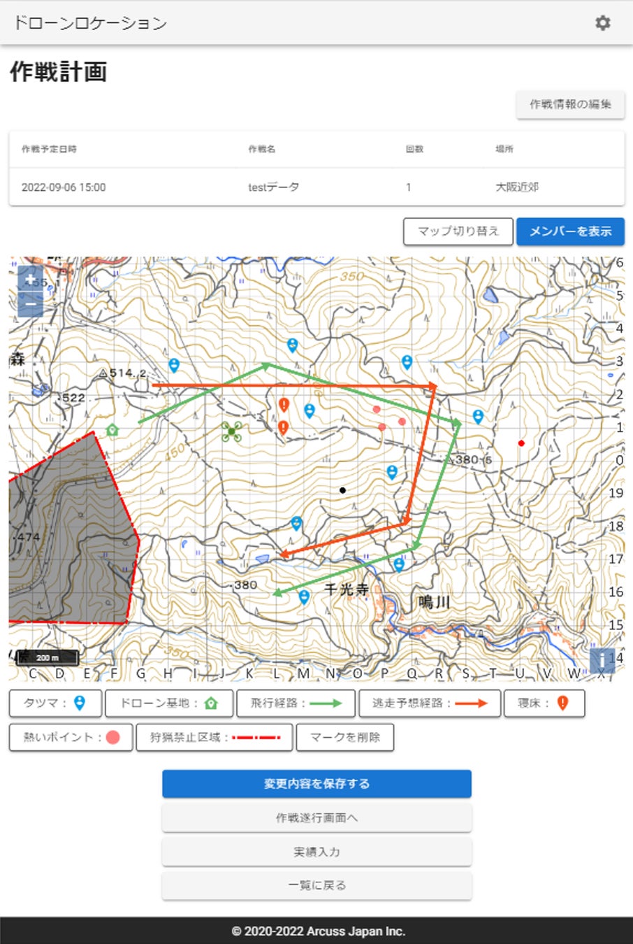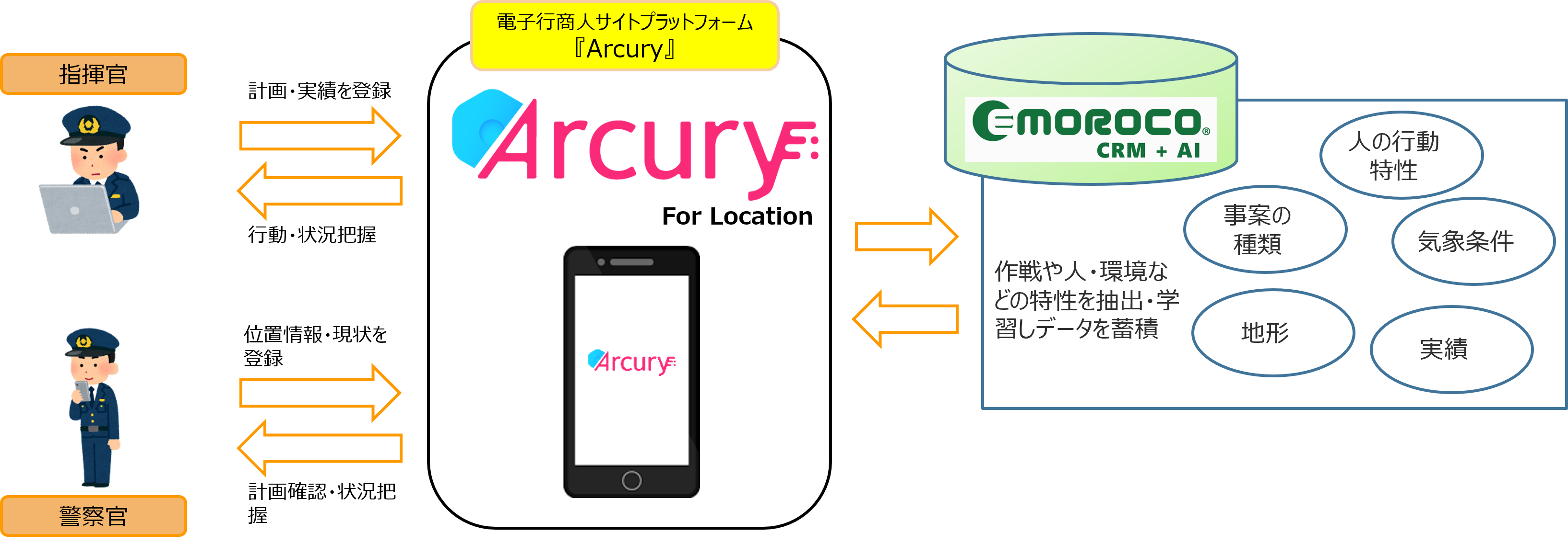 アーカス・ジャパンが提供するArcury for Locationは、狩猟、イベント、災害時の救助活動等、チーム内の動きをリアルタイムで把握し、作戦の計画から遂行・評価までを支援するサービスです。電子行商人(EM)サイトプラットフォームであるArcuryをベースとしておりますため、CRM(顧客管理)とAI(人工知能)が一体となり、作戦遂行後の評価結果から類似パターンを学習し、効率よく作戦遂行が行える計画を提案します。