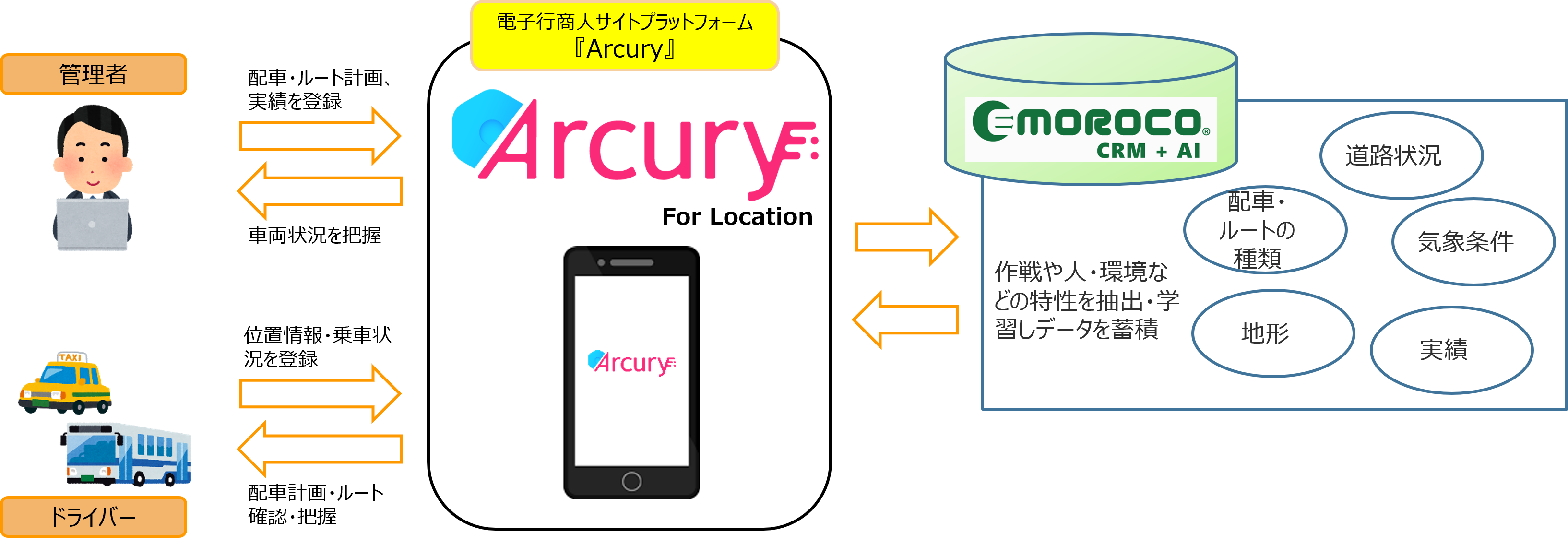 - 地域情報を活用したツアープランの案内(Arcury for Travel):Arcuryで保持する地域情報と個客情報をEMOROCOで分析し、最適なツアープランやオススメスポット等、趣味嗜好に合った経路を提案するガイド型マッチングサービス