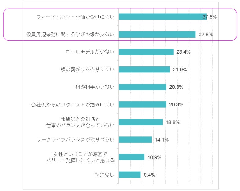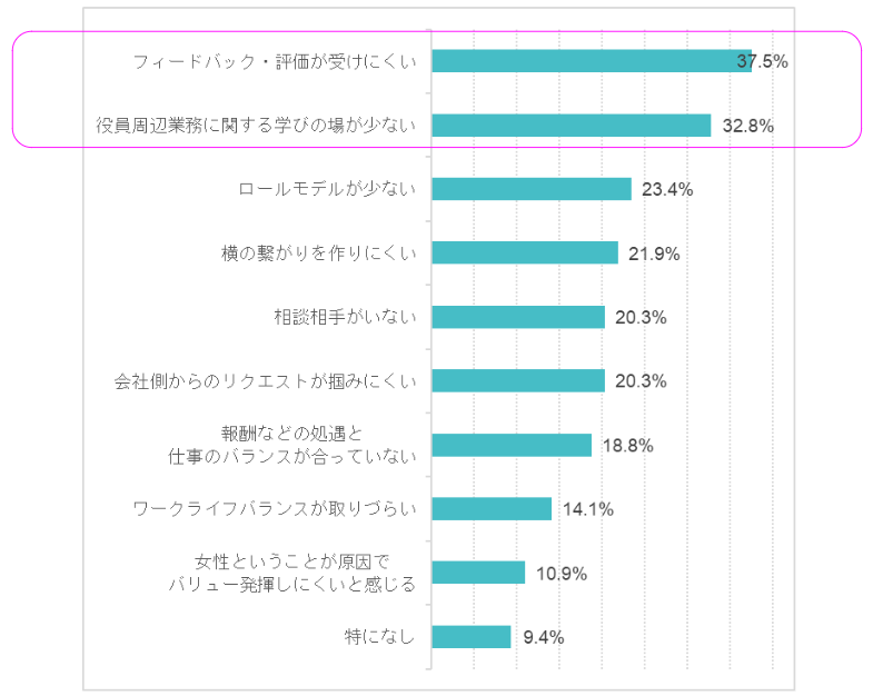 「フィードバック・評価が受けにくい」が37.5%、次いで「役員周辺業務に関する学びの場が少ない」が32.8%(複数回答)
