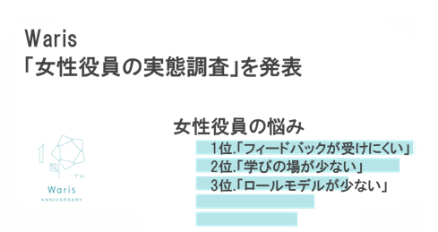 Waris、「女性役員の実態調査」を発表 悩みは「フィードバックが受けにくい」「学びの場が少ない」
