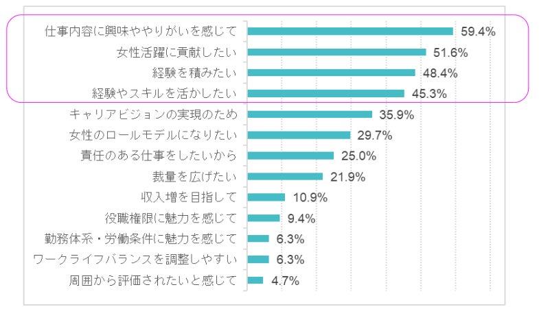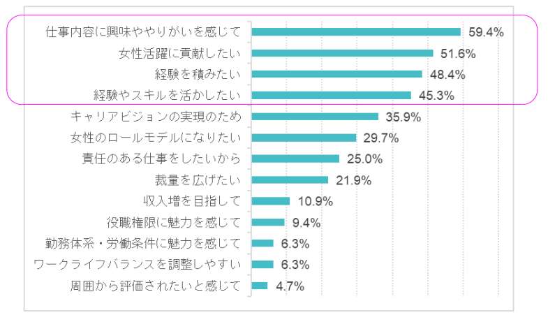 「仕事内容に興味ややりがいを感じて」が59.4%、次いで「女性活躍に貢献したい」が51.6%、「経験を積みたい」が48.4%、「経験やスキルを活かしたい」が45.3%となった(複数回答)