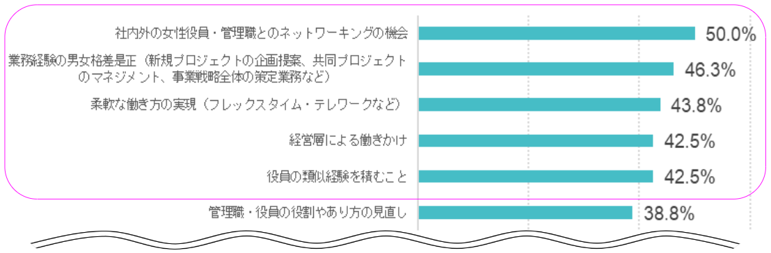 「社内外の女性役員・管理職とのネットワーキングの機会」が50%、次いで「業務経験の男女格差是正(新規プロジェクトの企画提案、共同プロジェクトのマネジメント、事業戦略全体の策定業務など)」が46.3%、「柔軟な働き方の実現(フレックスタイム・テレワークなど)」が43.8%、「経営層による働きかけ」「役員の類似経験を積むこと」が42.5%となった(複数回答)
