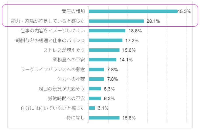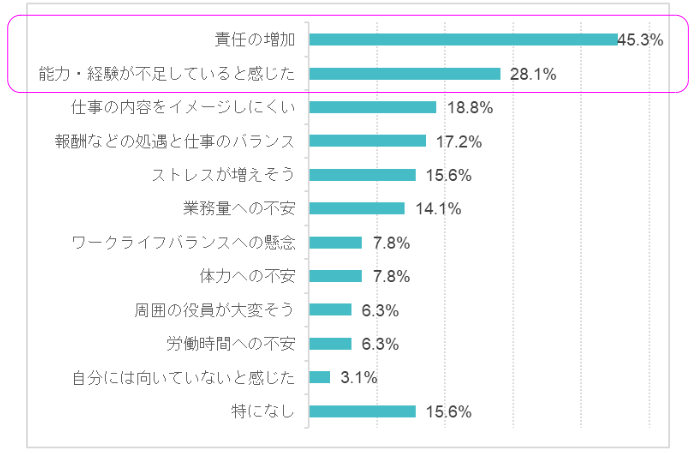 「責任の増加」が45.3%、次いで「能力・経験が不足していると感じた」が28.1%(複数回答)