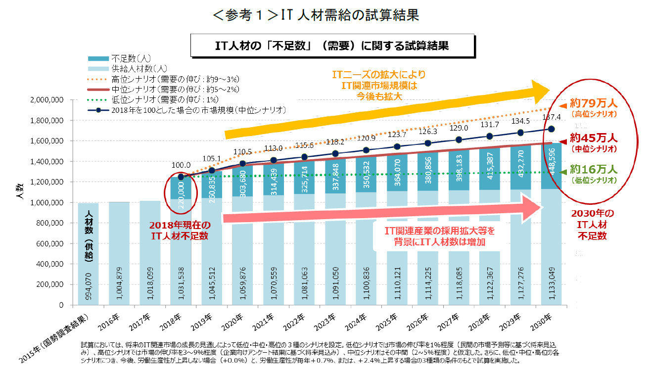 今後、IT産業の成長について、IT人材不足の解消、さらには、産業構造変化に対応した高度技術を有する先端IT人材・AI人材の拡大が求められます。