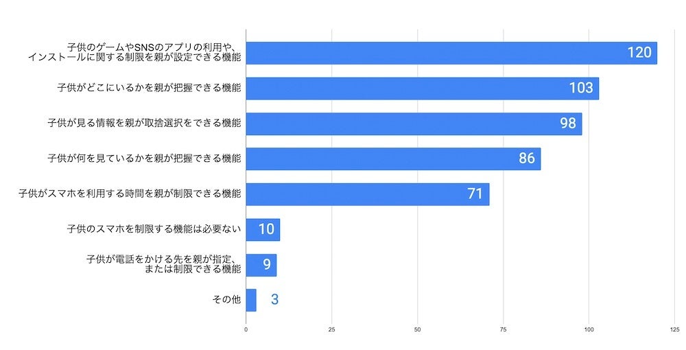 「子供がスマホ(もしくはキッズフォンなどの携帯電話)を使うときにあったらいいと思う機能は何ですか」という質問に対して、子供のスマホの利用を制限できる機能を求める回答が多くなりました。