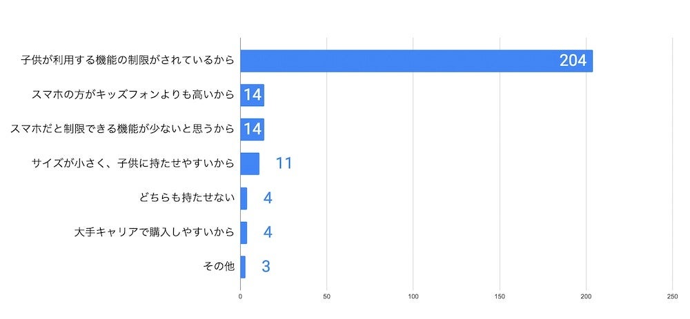 スマホにも機能を制限できるアプリなどはありますが、はじめから機能が制限できる「キッズフォンなどの子供用の携帯電話」を持たせたい方が多いことがわかります。