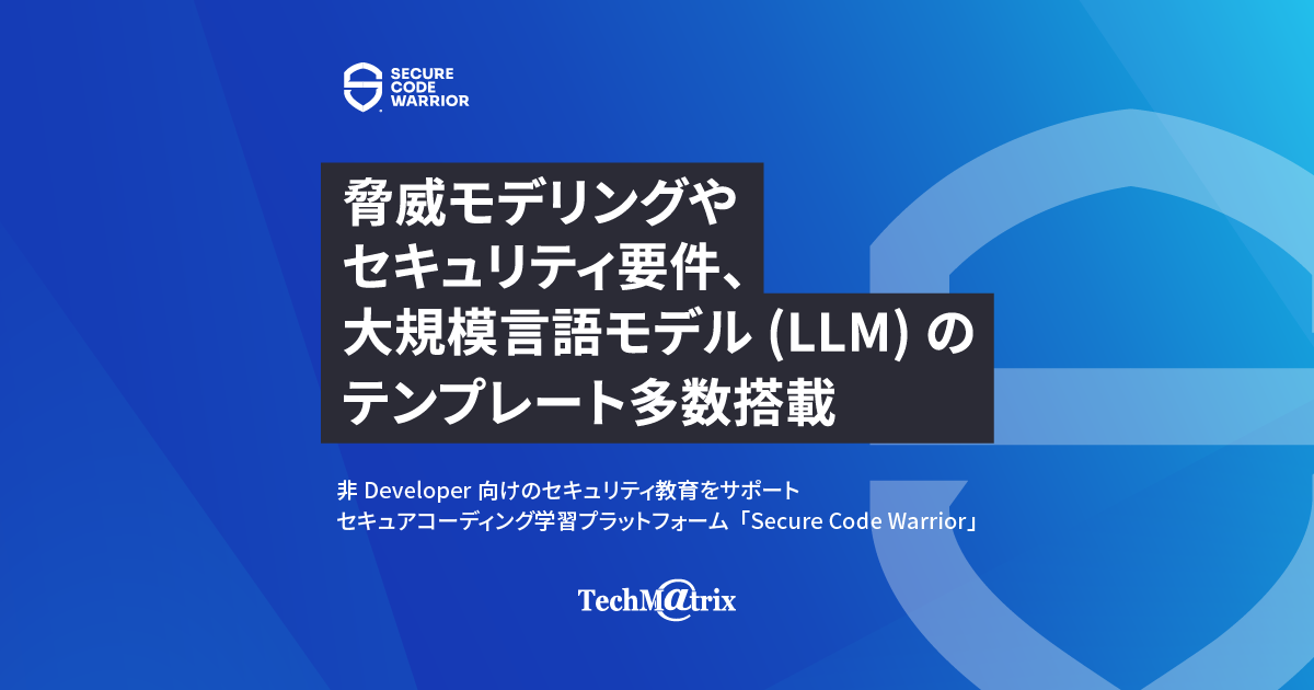 テクマトリックス株式会社(本社:東京都港区、代表取締役社長:矢井 隆晴、以下「テクマトリックス」)は、豪州Secure Code Warrior Pty Ltd(本社:豪州ニューサウスウェールズ州、最高経営責任者:Pieter Danhieux、以下「Secure Code Warrior社」)が提供するセキュアコーディング学習プラットフォーム「Secure Code Warrior」について、セキュリティ標準規格と法規に関連する学習、脅威モデリング、セキュリティ要件や大規模言語モデル(LLM)などへの対応が開始されたことを発表いたします。テクマトリックスは、国内総販売代理店として、ソフトウェア開発に携わるお客様を対象に、本製品の日本国内での販売、マーケティング、ユーザーサポートなどの活動を展開してまいります。