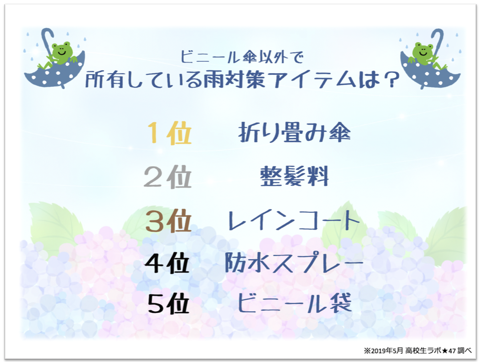 ビニール傘以外で雨対策として高校生が所有しているアイテムを調査した結果、1位は折り畳み傘となりました。